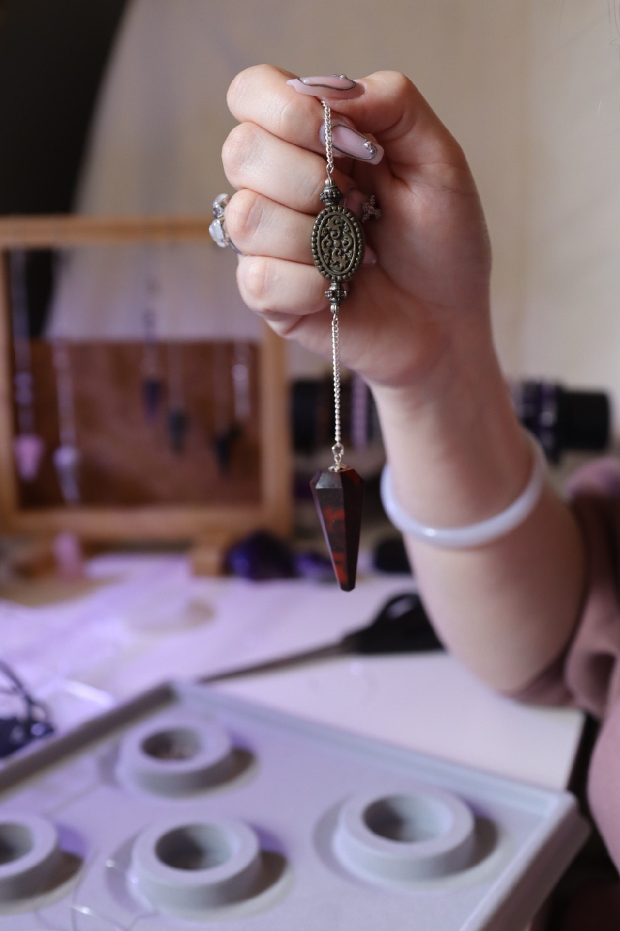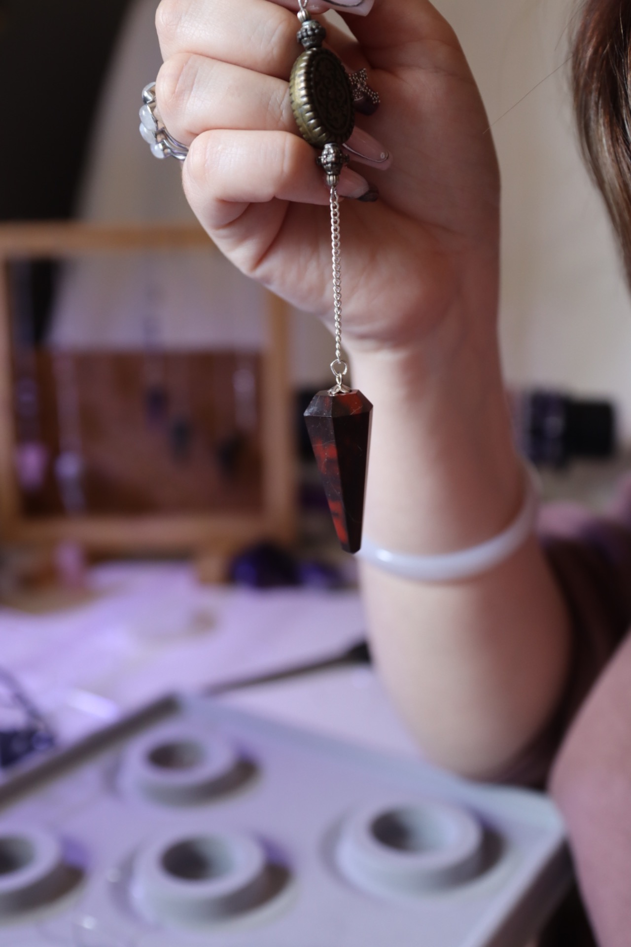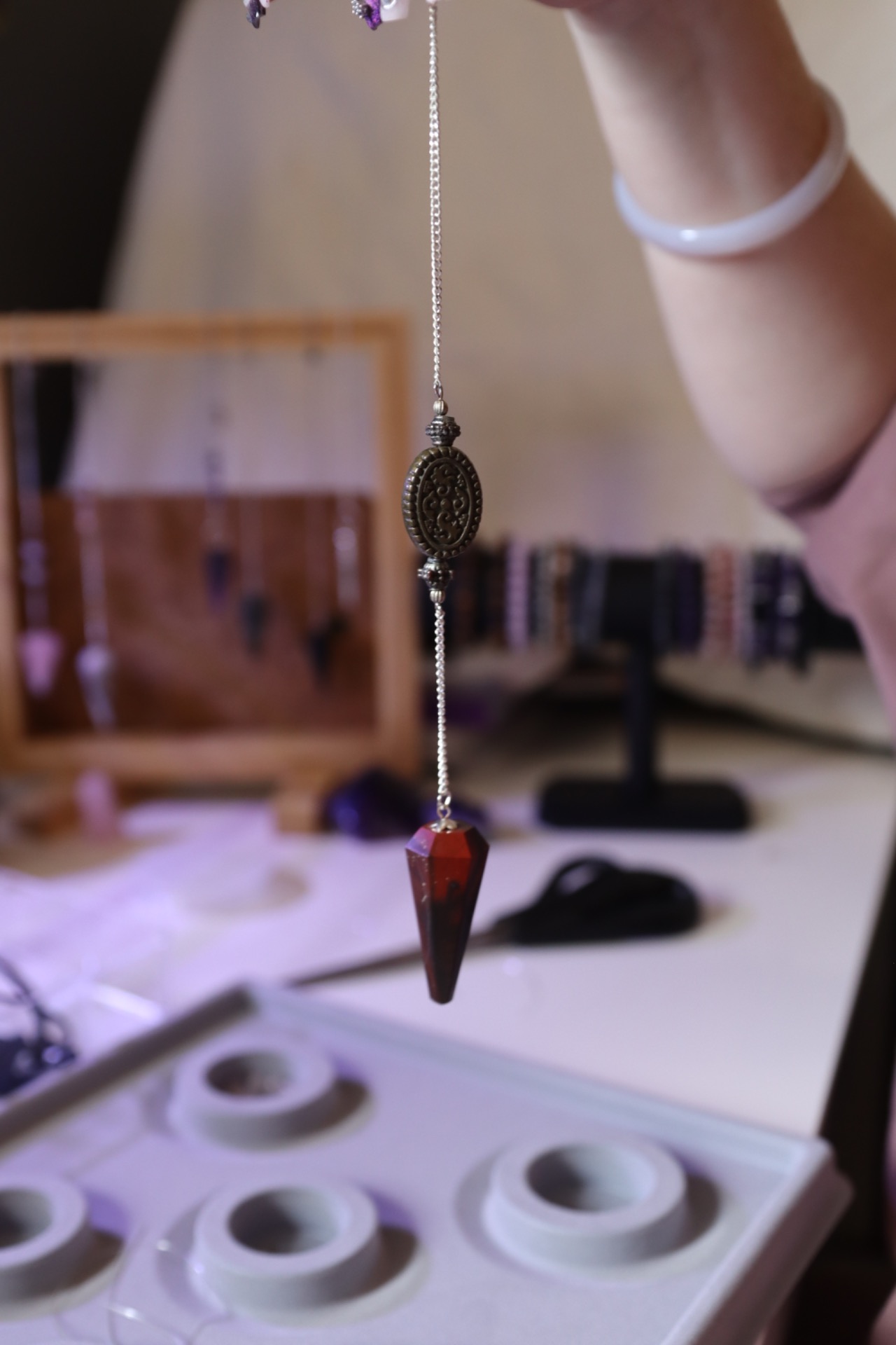 Ce pendule en jaspe rouge, entièrement réalisé à la main, est une création unique, pensée pour allier beauté, énergie et précision.